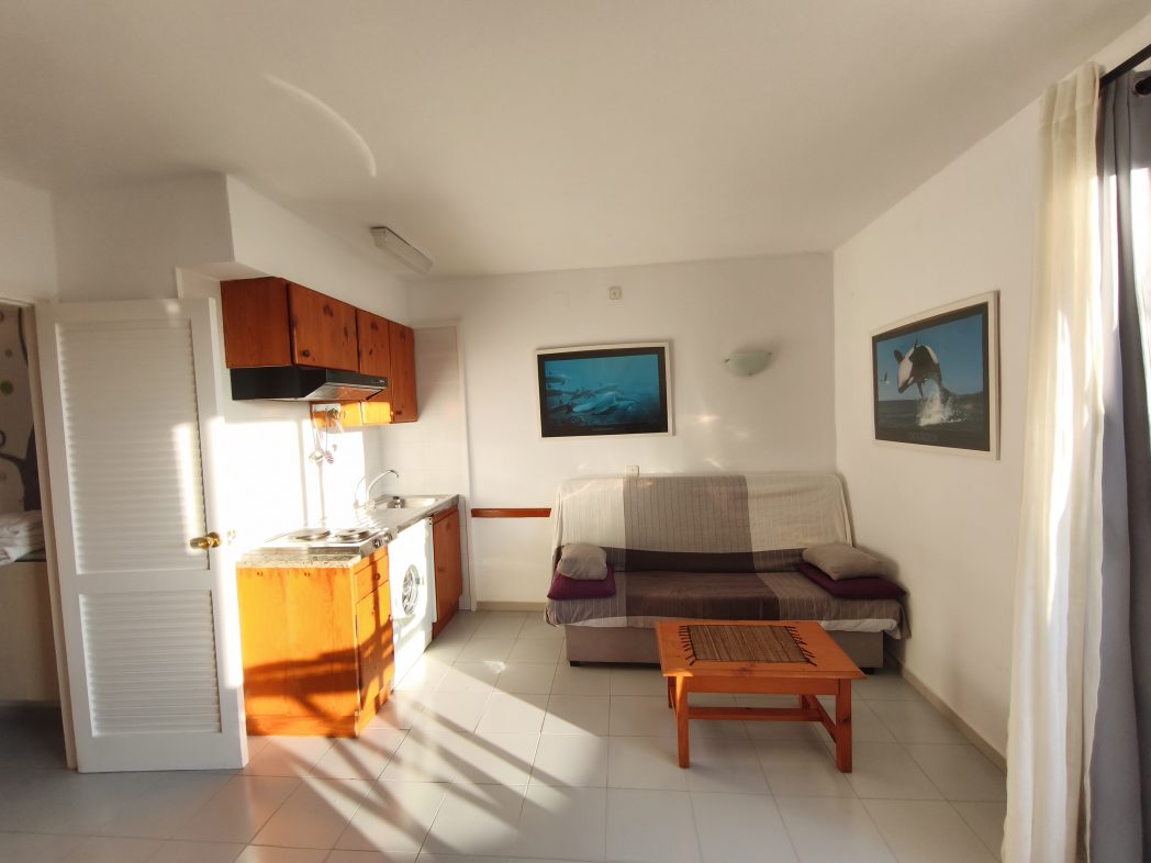 El estudio dispone de un espacio funcional y luminoso con cocina y comedor integrados en un solo ambiente, una habitación semiindependiente que aporta privacidad, y un agradable balcón donde relajarse y aprovechar el clima mediterráneo.
